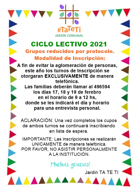 El Jardín Comunal TaTeTi de Pueblo Andino abrirá las inscripciones para el ciclo lectivo 2021, en esta oportunidad y por motivo de la pandemia, con el fin de evitar la aglomeración de personas, los turnos para la inscripción deben ser solicitados de manera telefónica.