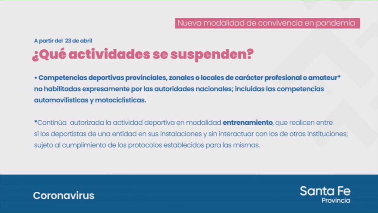 Así lo anunció el Gobernador Omar Perotti junto a la Ministra de Salud, Sonia Martorano. «Quedan suspendidas las competencias deportivas provinciales, zonales o locales de carácter profesional o amateur no habilitadas expresamente por las autoridades nacionales, incluidas las competencias automovilísticas y motociclísticas», informaron.