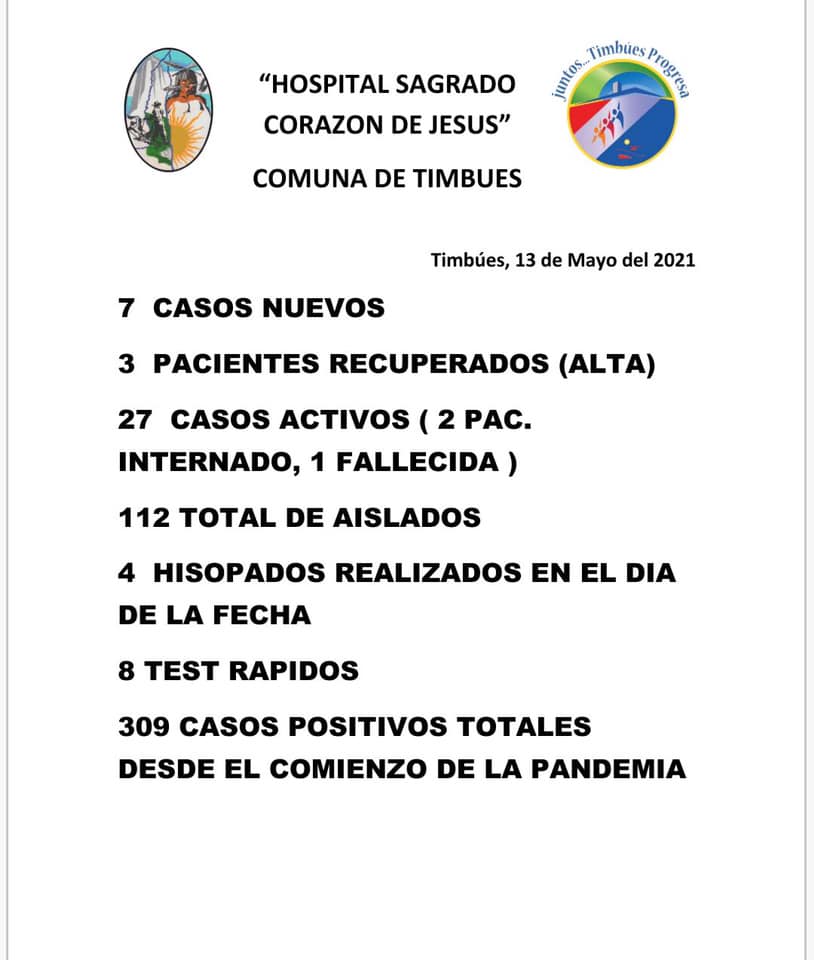 El Hospital Sagrado Corazón de Jesús y la Comuna de Timbúes informaron en el Parte Epidemiológico local de este jueves, el crecimiento de la curva de contagios y una noticia triste.