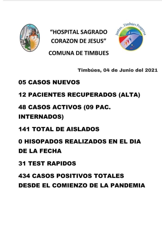 Este viernes se sumaron 5 casos y hubo 12 pacientes que recibieron el alta en Timbúes, por lo que el total de casos activos a la fecha es de 48, según el último reporte epidemiológico del Hospital Sagrado Corazón de Jesús y la Comuna de Timbúes.