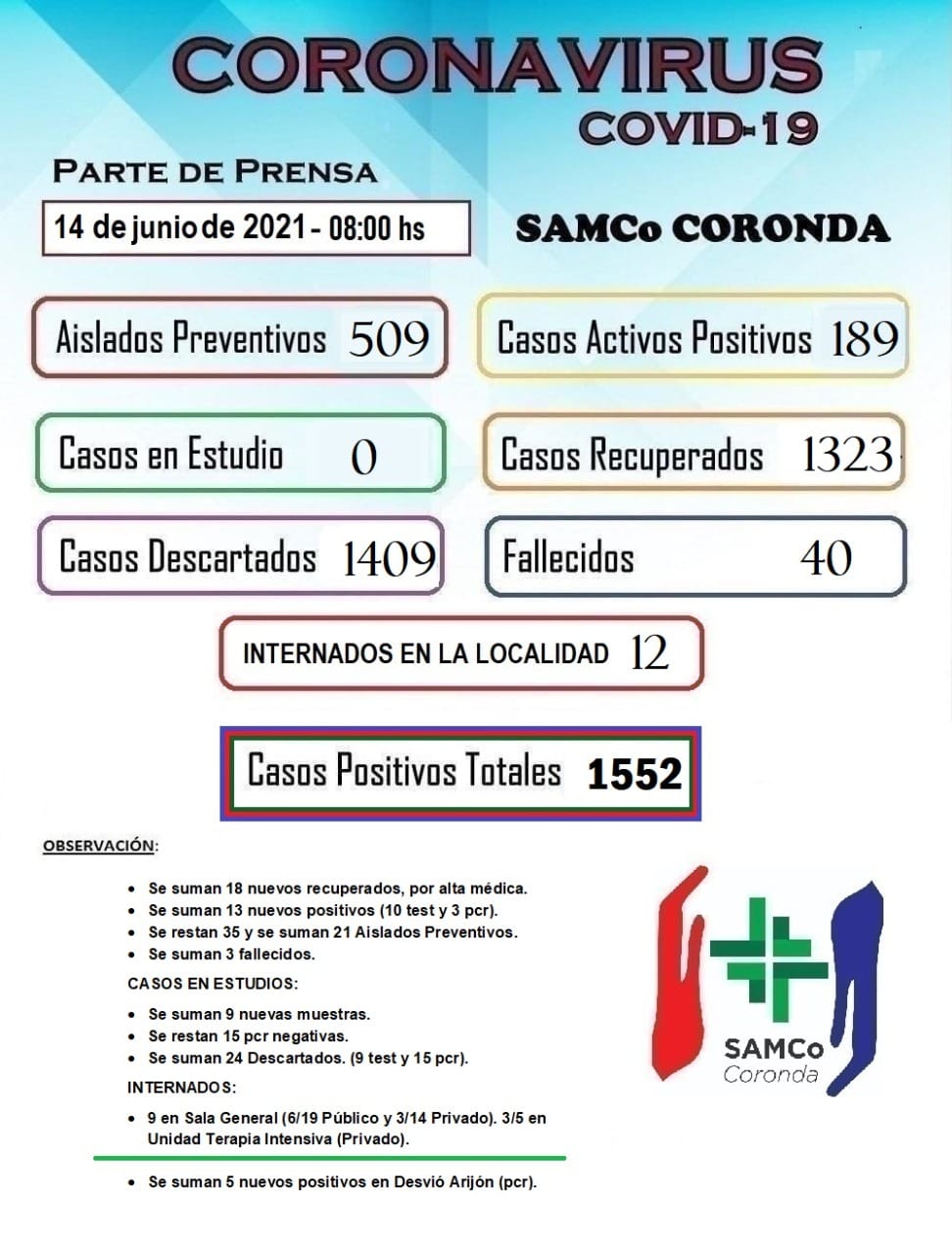 El comunicado de las 8 de la mañana arrojó la triste noticia de tres víctimas fatales durante el fin de semana. Con estos registros, en total, ya son 40 los muertos en Coronda debido a la pandemia.