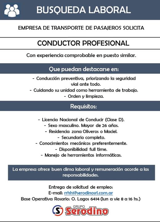 La empresa de transporte público de pasajeros Serodino, lanzó una búsqueda laboral para conductor profesional. Solicita experiencia comprobable en un puesto similar.