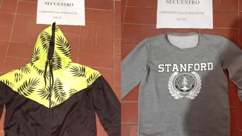 Se trata de una joven la cual tenía en su poder parte de las prendas sustraídas: una campera negra y amarillo flúor con hojas color negras, talle 2 y un buzo color gris con escritura STANFORL en color blanco en su frente. La joven fue trasladada a la sede de la Comisaría 3era.