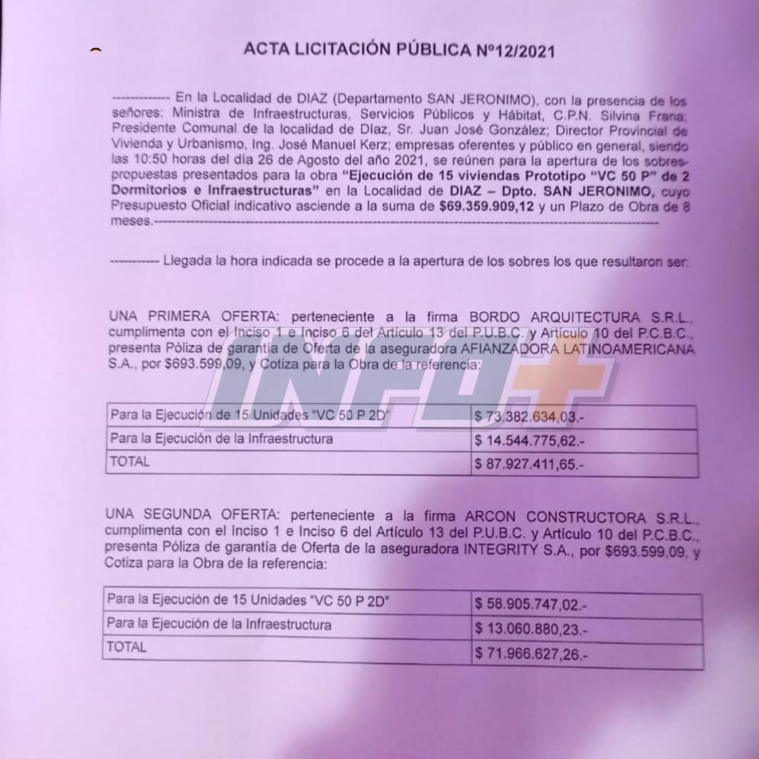 En la localidad de Díaz se realizó el acto para la licitación pública con la apertura de tres sobres. Se debe a la obra de ejecución de 15 viviendas Prototipo «VC 50 P» de dos dormitorios e infraestructuras.