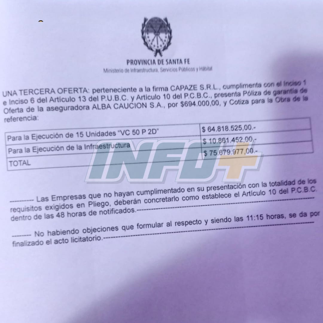 La primera oferta perteneció a la firma Bordo Arquitectura SRL con un total de 87.927.411 pesos. La segunda, de la firma Arcón Constructora, presentó un monto final de 71.966.627 y la tercera, de la firma Capaze, por un total de 75.679.977.