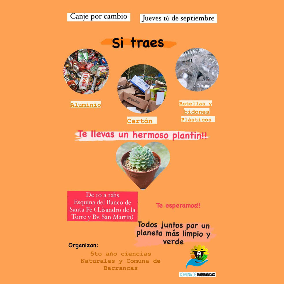 Se llevará a cabo este jueves 16 de septiembre de 10 a 12 horas y se acepta aluminio, cartón, botellas y bidones de plásticos. A cambio, quien colabore, podrá llevarse un plantín.