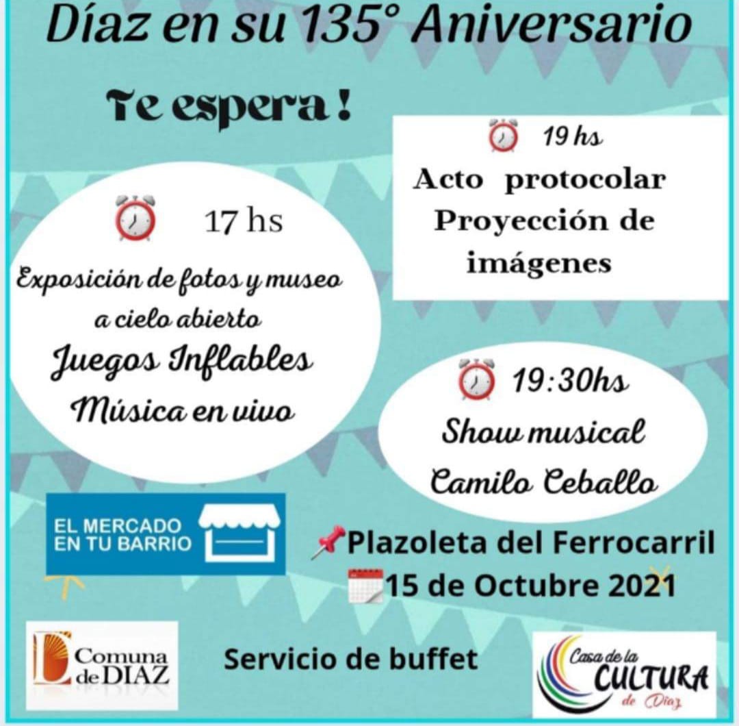 La Comuna de Díaz anunció las actividades que se llevarán a cabo en la localidad para festejar sus 135 años. Será el próximo viernes 15 de octubre en la plazoleta del ferrocarril.