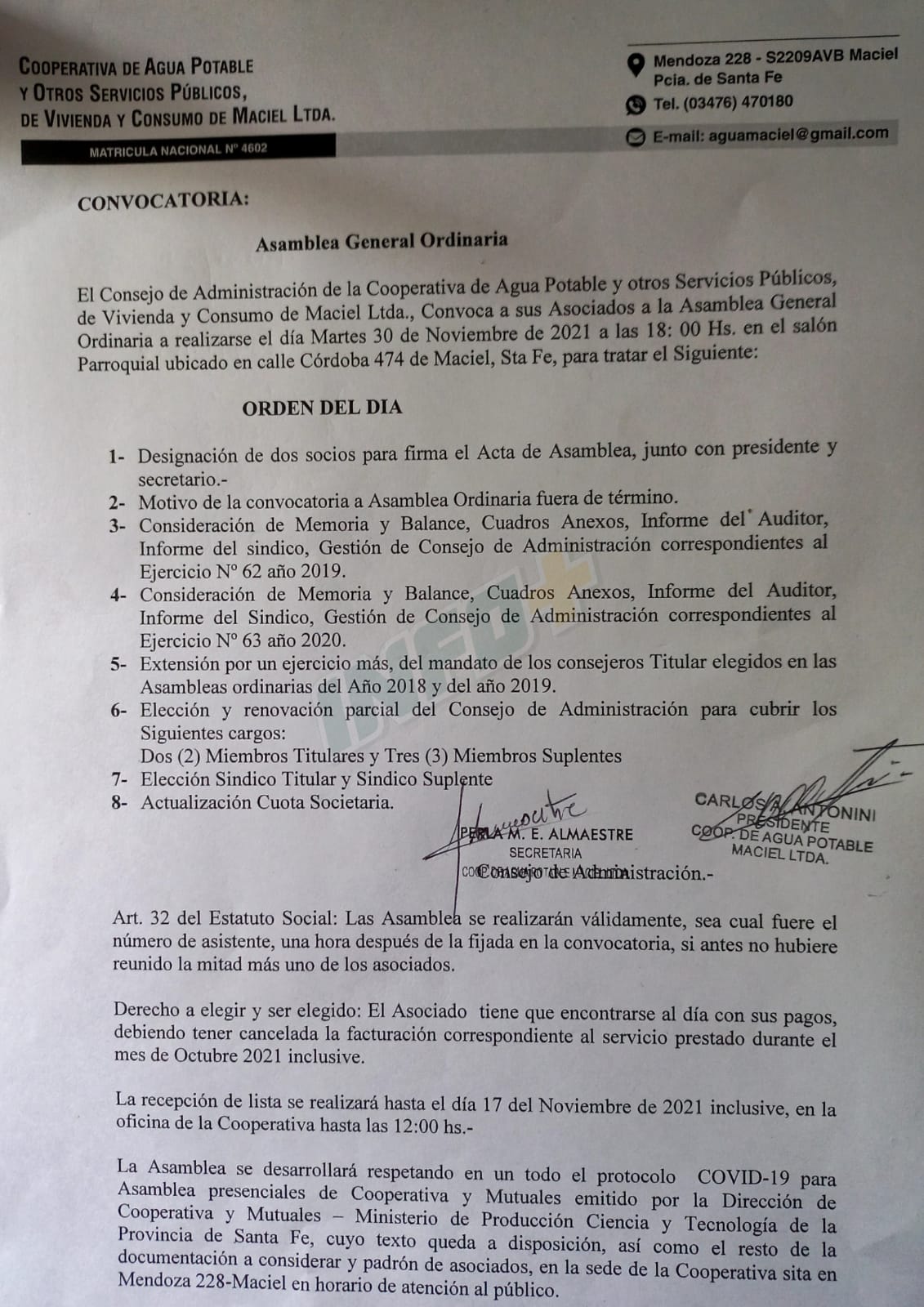 El Consejo de Administración de la Cooperativa de Agua Potable y otros Servicios Públicos, de Vivienda y Consumo de Maciel Ltda., Convoca a sus Asociados a la Asamblea General Ordinaria a realizarse el día Martes 30 de Noviembre de 2021 a las 18: 00 Hs. en el salón Parroquial ubicado en calle Córdoba 474 de Maciel, Sta Fe, para tratar el Siguiente: