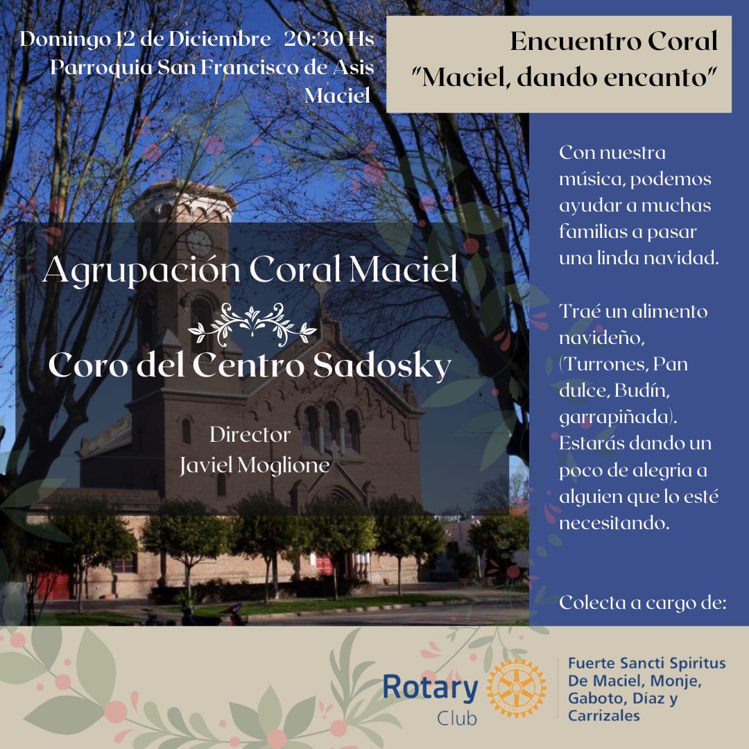 Agrupación Coral Maciel invita al Encuentro Coral ¨Maciel, dando encanto¨. Será a beneficio el próximo domingo 12 diciembre a las 20.30 horas en la Parroquia San Francisco de Asís.
