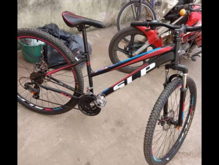 Se trata de una bicicleta marca SLP con cuadro de dama, de color negra con detalles en rojo y celeste tal como se ve en la imagen compartida.