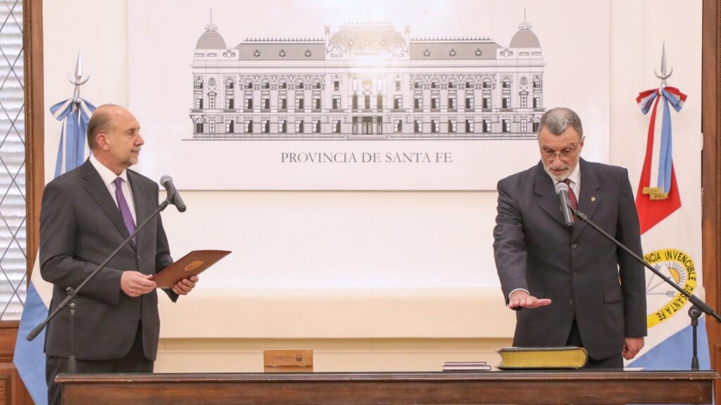 El gobernador de la provincia, Omar Perotti, le tomó juramento al nuevo ministro de Seguridad de la provincia, el comisario general Rubén Rimoldi, quien reemplazó al ahora ex ministro Jorge Lagna.
