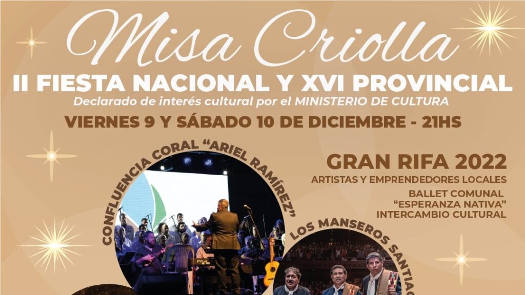 Ya está todo confirmado para la II Fiesta Nacional y XVI Provincial de la Misa Criolla que se llevará adelante el próximo 9 y 10 de diciembre a partir de las 21 horas en el Polideportivo Comunal (Rivadavia y Solis), con entrada libre y gratuita.