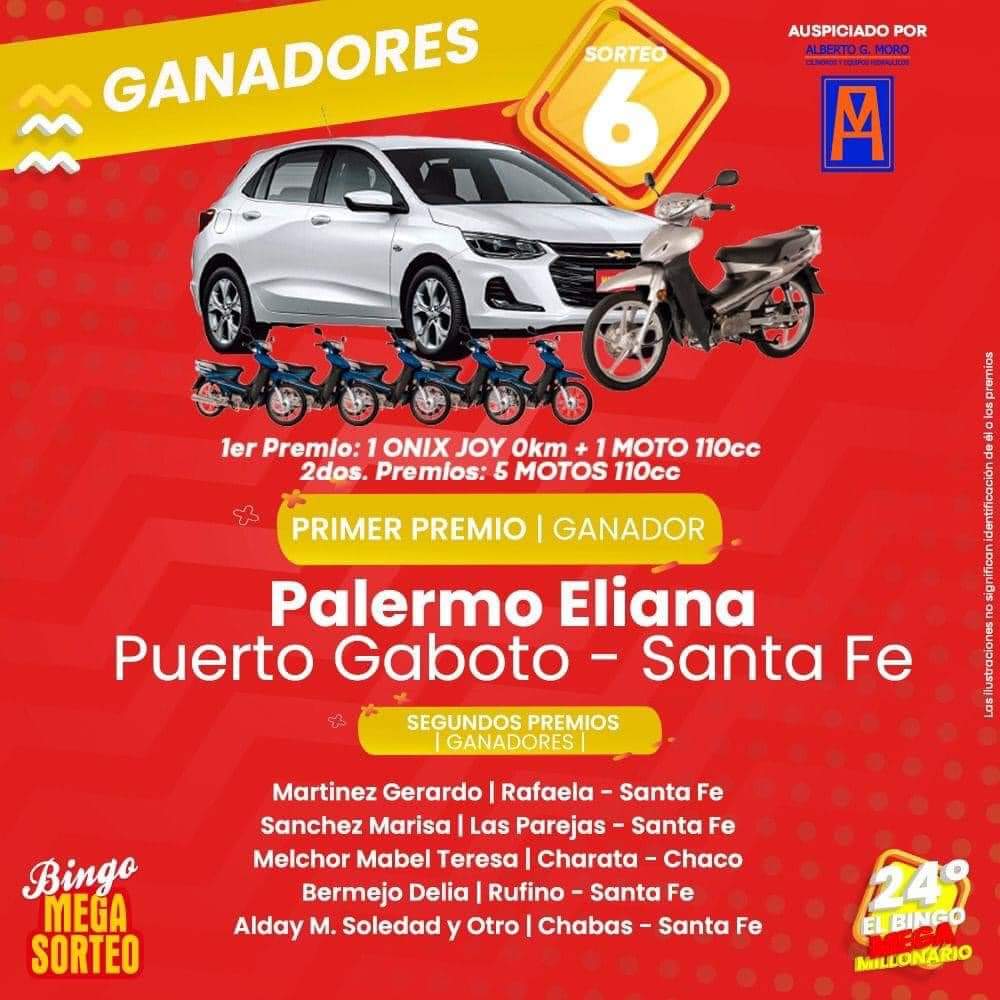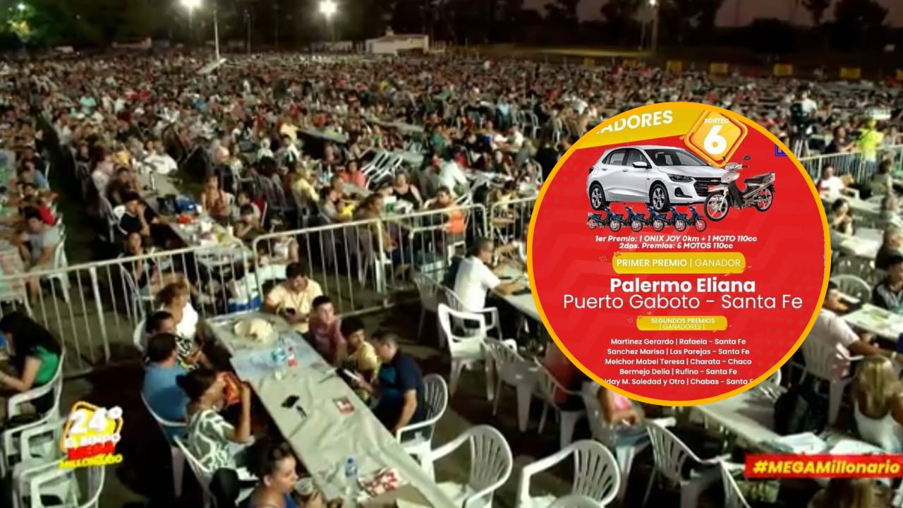 Uno de ellos fue para Eliana Palermo, una vecina de Puerto Gaboto que se llevó el primer premio del sexto sorteo de la noche: un automóvil Chevrolet Onix Joy 0km y una motocicleta 110cc.