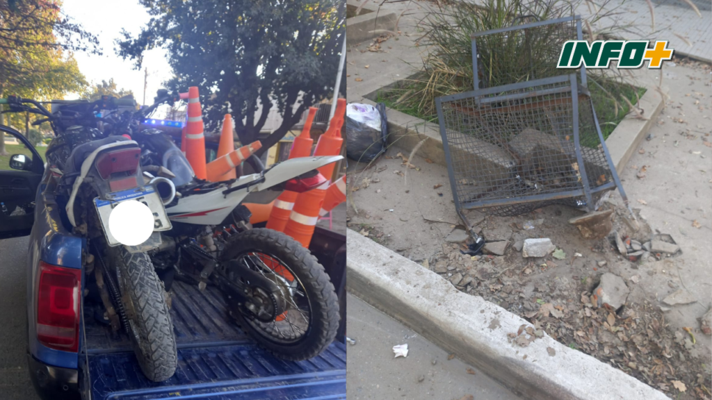 Producto del fuerte choque, también quedó destruido un cesto de basura y parte de la vereda. Personal de la Guardia Urbana Comunal, de la Comisaría 4ta y de salud trabajaron en la emergencia.