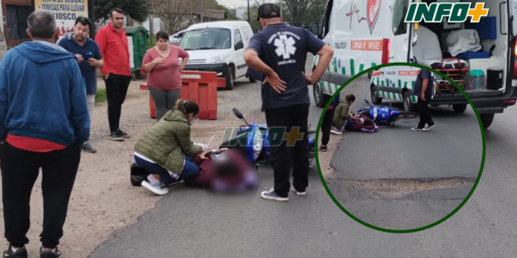 A metros de donde quedó la moto, recostada sobre el asfalto, se observa un bache de gran tamaño en la traza que provocó el siniestro.