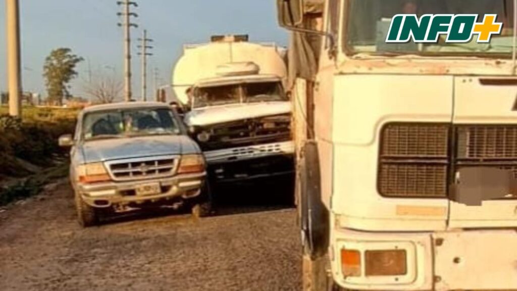 Colisionaron un camión Fiat de color blanco con acoplado, cargado de maíz, cuyo chofer era un joven de 23 años, oriundo de Centeno, un camión marca Dogge, con cisterna regador conducido por un masculino de 44 años, domiciliado en la ciudad de Puerto San Martín, y una camioneta que se encontraba estacionada marca Ford Ranger conducida por una mujer de 44 años domiciliada en Timbúes.