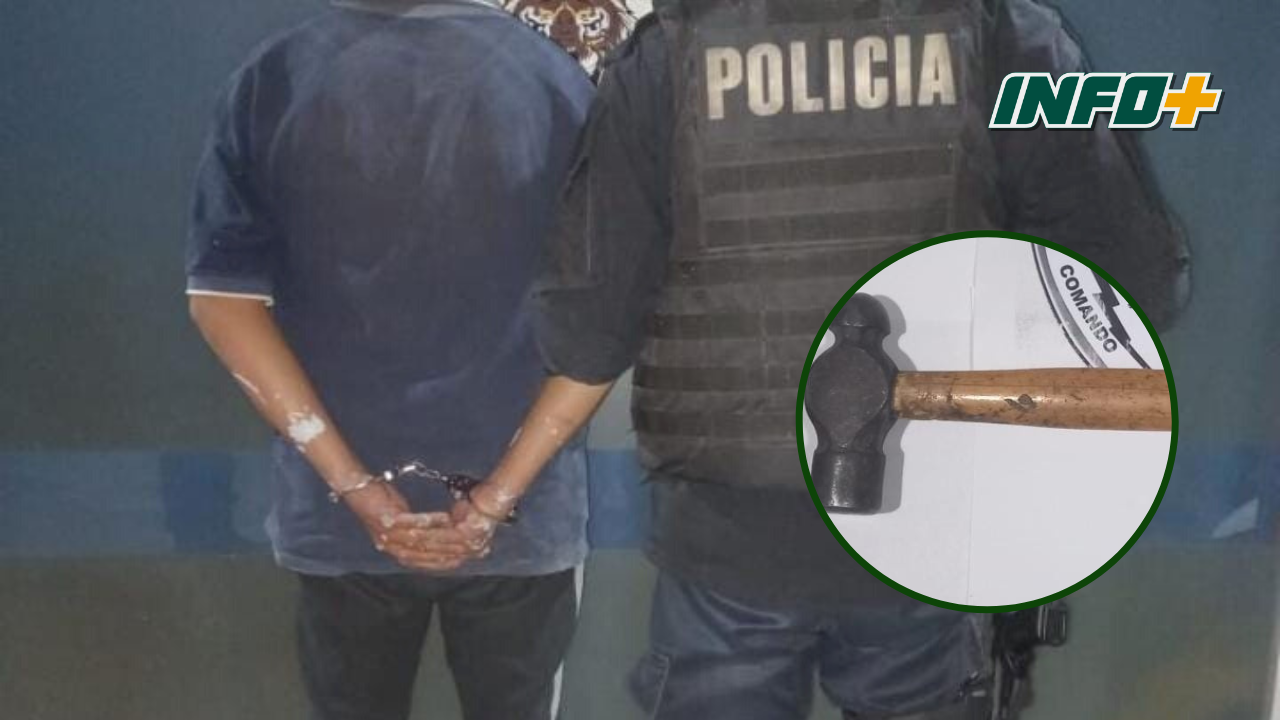 Arribados al lugar, procedieron a la aprehensión del llamado A.I.E, de 21 años, autor del hecho que se investiga. Entre sus prendas tenía oculto un martillo de un mango de 30 cm de madera natural, y la cabeza del martillo de bola, y una parte en forma cuadrada.
