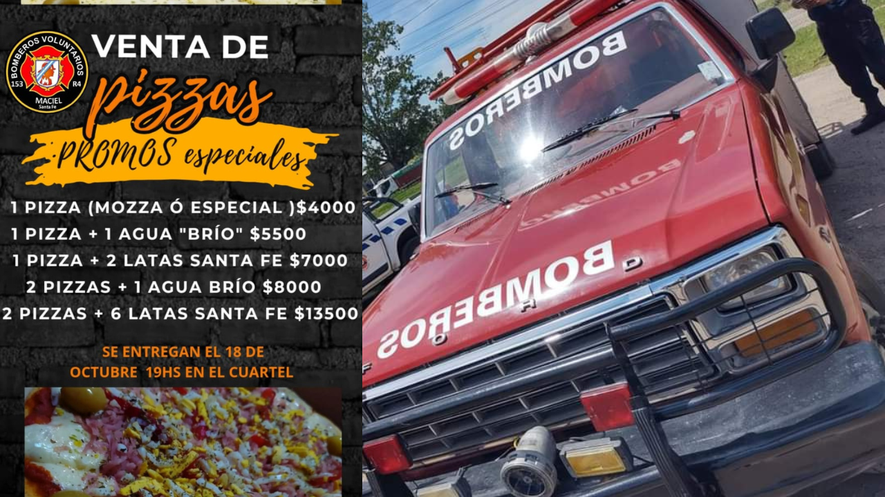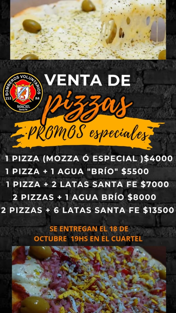 Los Bomberos Voluntarios de Maciel llevan adelante una venta de pizzas con promos especiales. Se entregarán el 18 de octubre en el cuartel, a partir de las 19 horas.