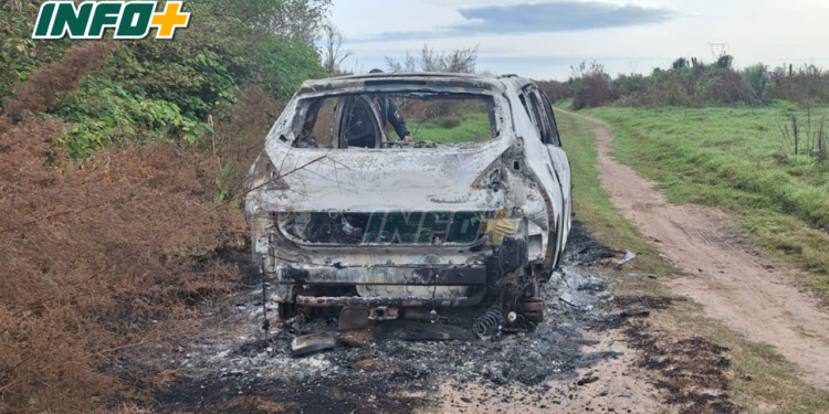 Un automóvil apareció completamente incinerado en un camino rural paralelo a la autopista Rosario Santa Fe, a la altura del kilómetro 41, a la altura de Oliveros: le faltaban sus dos chapas patentes, el capot y sus cuatro ruedas.