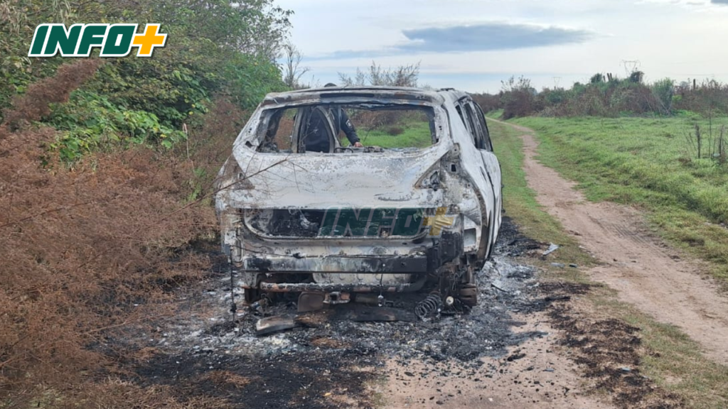 Un automóvil apareció completamente incinerado en un camino rural paralelo a la autopista Rosario Santa Fe, a la altura del kilómetro 41, a la altura de Oliveros: le faltaban sus dos chapas patentes, el capot y sus cuatro ruedas.