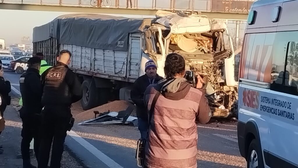 Un fuerte choque entre dos camiones se produjo en la mañana de este jueves en la autopista Rosario Córdoba. Ambos choferes son compañeros y viajaban de Córdoba hacia el puerto de Timbúes.