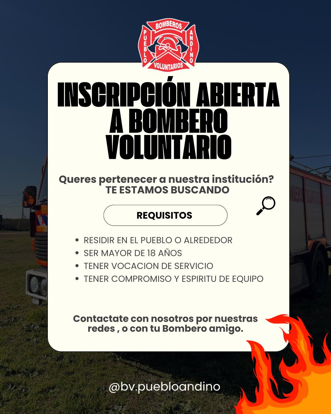 La Asociación de Bomberos Voluntarios de Pueblo Andino lanzó una nueva convocatoria abierta para incorporar integrantes a su cuerpo activo. Bajo el lema “Te estamos buscando”, la institución invita a vecinas y vecinos del pueblo y zonas cercanas a sumarse como voluntarios.