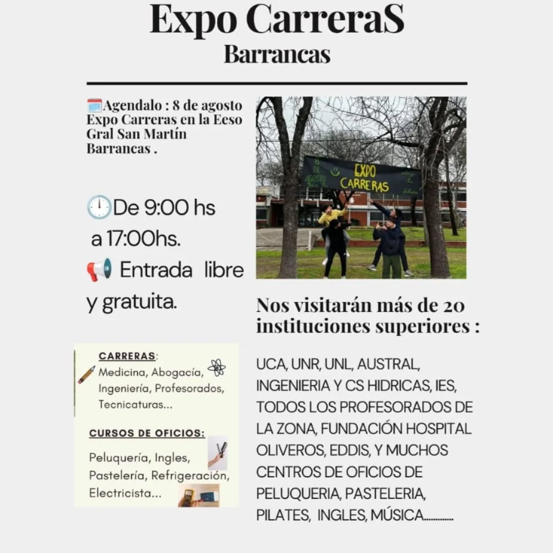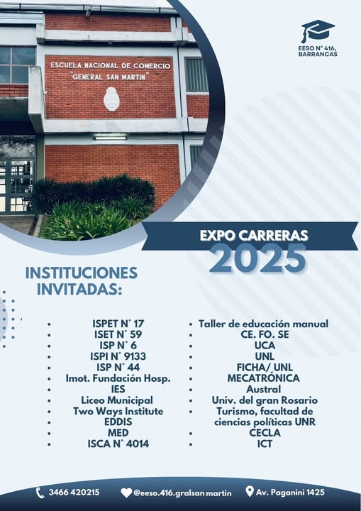 El próximo viernes 8 de agosto, la Escuela de Educación Secundaria Orientada N.º 416 “Gral. San Martín” será sede la Expo Carreras, un evento pensado para estudiantes que se encuentran en la búsqueda de su futuro profesional o laboral.
