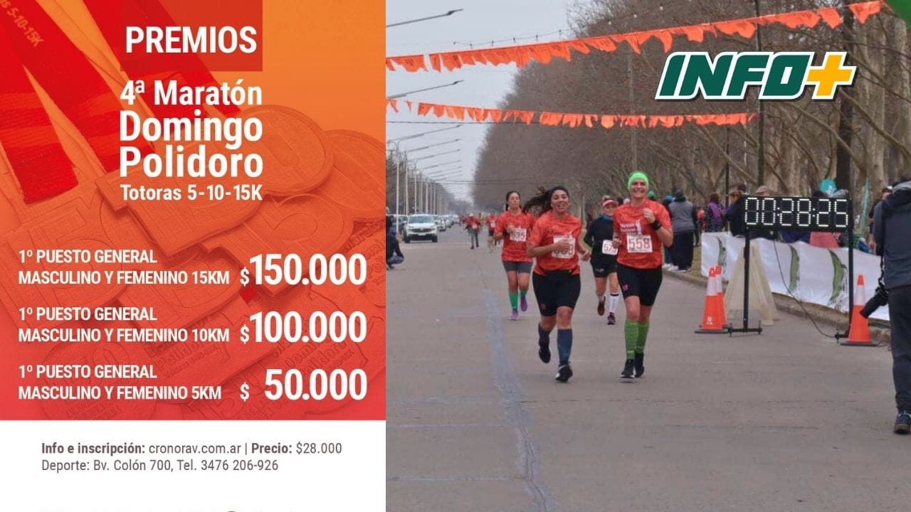 La tradicional Maratón Domingo Polidoro de la ciudad de Totoras, uno de los eventos deportivos más esperados de la región, vuelve con todo este 17 de agosto a las 9, y este año suma un atractivo especial: $600.000 en premios en efectivo para quienes obtengan los primeros puestos en cada categoría.