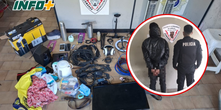 Al identificarlo, el joven, domiciliado en la ciudad, mostró un marcado nerviosismo y tras requisar las dos bolsas de consorcio y la mochila que llevaba, los uniformados encontraron una gran cantidad de elementos, entre ellos dos estufas, un monitor, parlantes, controles remotos, equipos de sonido, utensilios de cocina, ropa, dispositivos electrónicos, teléfonos celulares y dinero en efectivo.