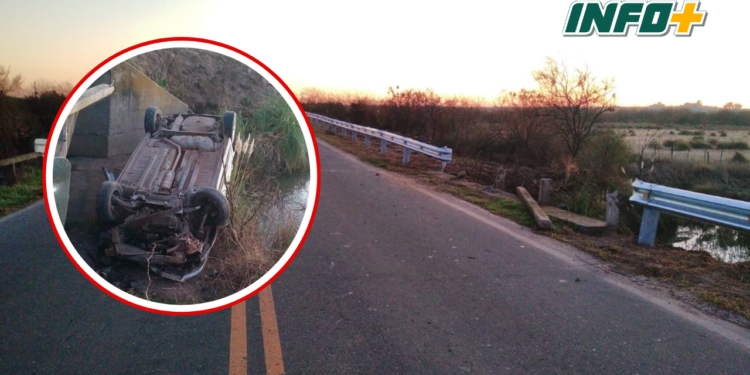 Por causas que aún se investigan, un vehículo Citroën C4, desbarrancó y terminó volcando a la vera del arroyo, quedando con sus cuatro ruedas hacia el cielo.