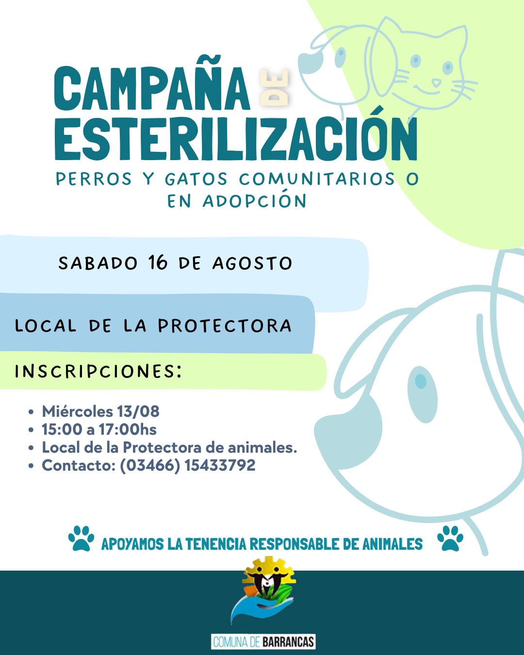 La Comuna de Barrancas, junto a la Protectora de Animales, anunció una nueva campaña de esterilización gratuita destinada a perros y gatos comunitarios o en situación de adopción. La jornada tendrá lugar el próximo sábado 16 de agosto en el local de la Protectora.