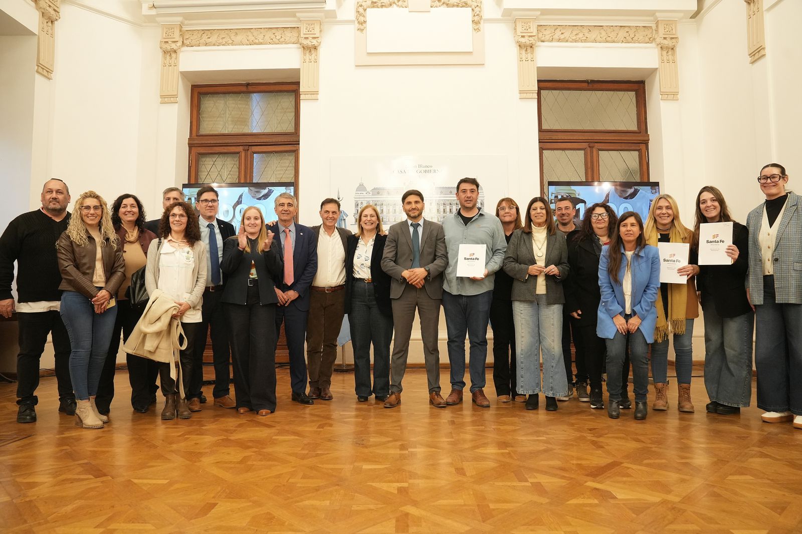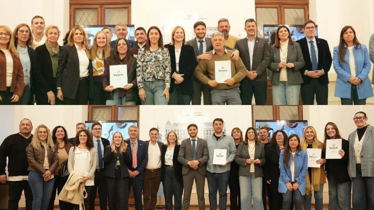 El gobernador Maximiliano Pullaro encabezó este miércoles, en el Salón Blanco de la Casa de Gobierno, el acto de firma de convenios con 61 municipios y comunas para la construcción de 79 aulas en establecimientos educativos, en el marco del Programa 1000 Aulas del Ministerio de Educación de Santa Fe.