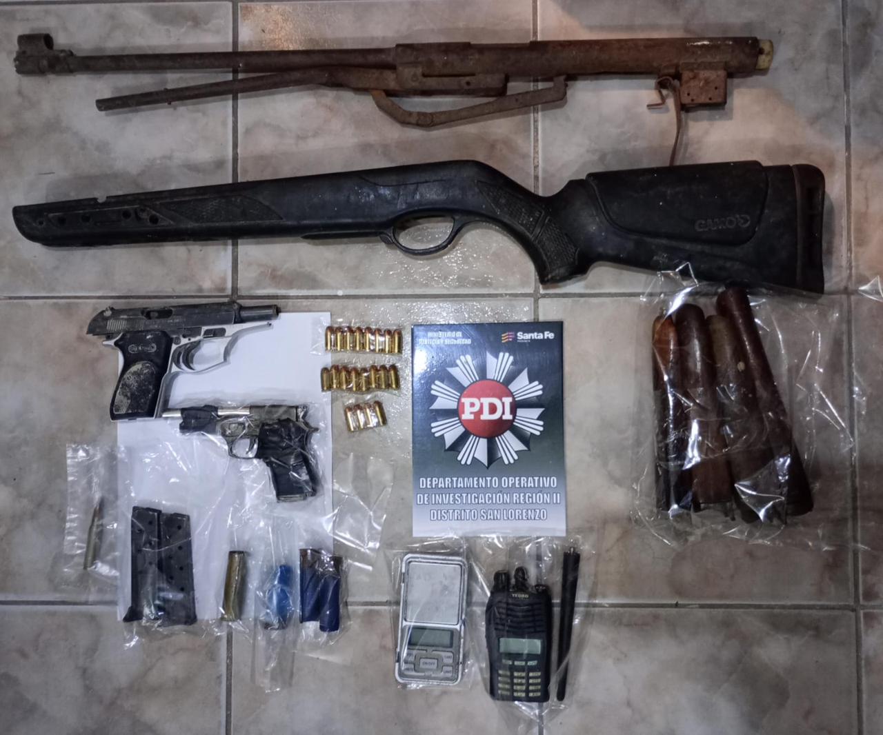 En tanto que se procedió al secuestro de armas y elementos vinculados a la investigación: 1 pistola calibre 38 con dos cargadores y 19 cartuchos; 1 pistola de fabricación casera (“tumbera”) con cartucho en recámara; 1 handy; 1 balanza de precisión; municiones de FAL; 3 cartuchos de escopeta calibre 12 y 16; y distintas partes de escopeta.