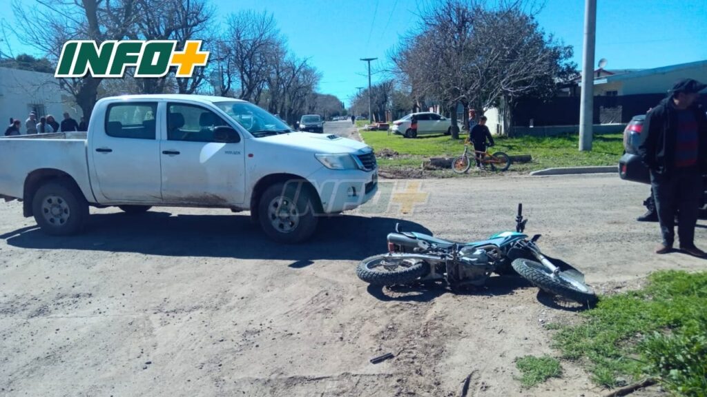 Una moto y una camioneta colisionaron cerca de las 11.50 de este sábado en la esquina de calle Mitre y Tucumán, de la localidad de Oliveros. La joven a bordo del birrodado resultó con lesiones.