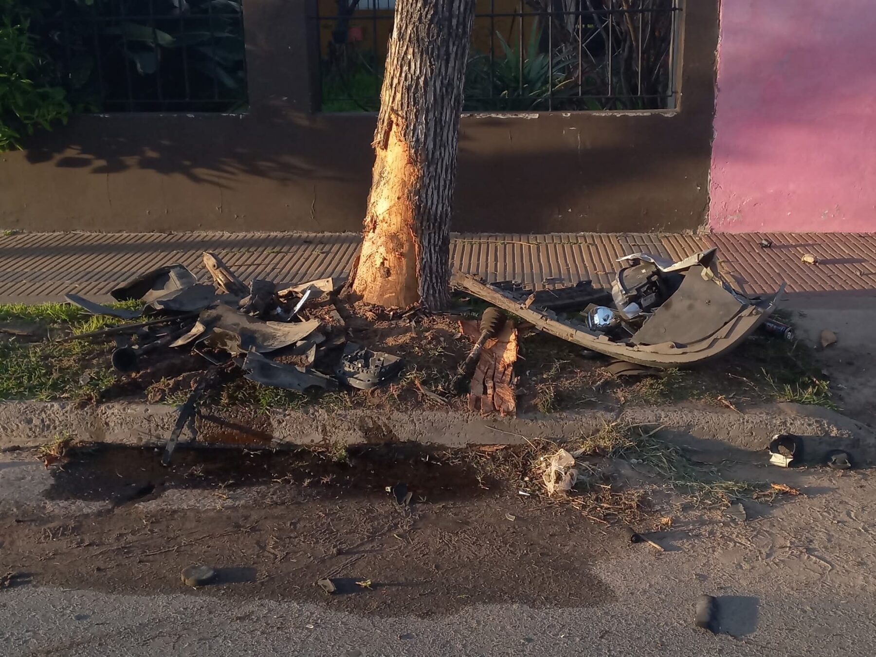 Tras chocar con la camioneta estacionada, el vehículo terminó su carrera descontrolada contra un árbol, causando importantes daños materiales.