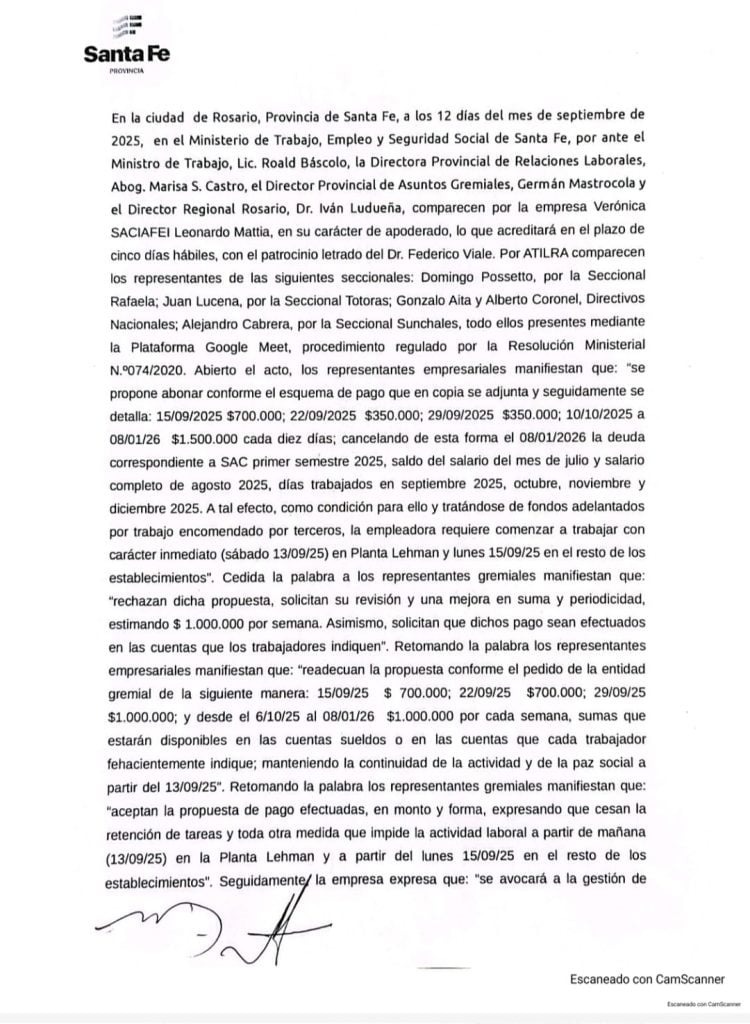 El acuerdo permitirá que el próximo lunes 15 de septiembre se reactive la producción en las tres plantas ubicadas en Lehmann, Suardi y Clason, según confirmaron fuentes oficiales a Info Más.