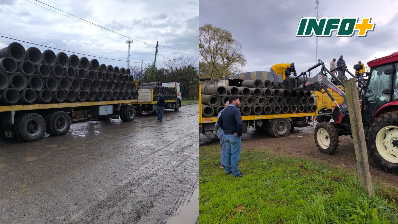 Una de las principales demandas de los vecinos pasa por el escurrimiento de las aguas y para eso se adquirieron 𝟭𝟴𝟬 𝘁𝘂𝗯𝗼𝘀 𝗱𝗲 𝗮𝗹𝗰𝗮𝗻𝘁𝗮𝗿𝗶𝗹𝗹𝗮𝘀 con recursos propios, que llegaron en la mañana de este lunes al pueblo en un camión y fueron recibidos bajo la lluvia por el propio jefe comunal.