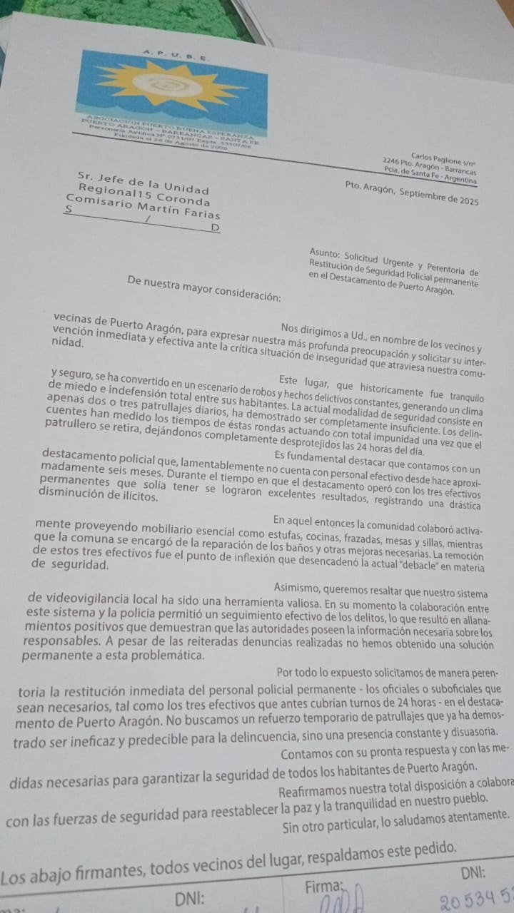 Los vecinos de Puerto Aragón atraviesan un momento de creciente preocupación por la inseguridad. Aseguran que crecieron los robos y hechos delictivos. La Asociación Vecinal Fuerte de la Buena Esperanza (A.P.U.B.E.) junto a un grupo de vecinos elaboraron un pedido urgente a las autoridades para que se restituya la presencia policial permanente en el destacamento local, que permanece sin personal fijo desde hace más de seis meses.