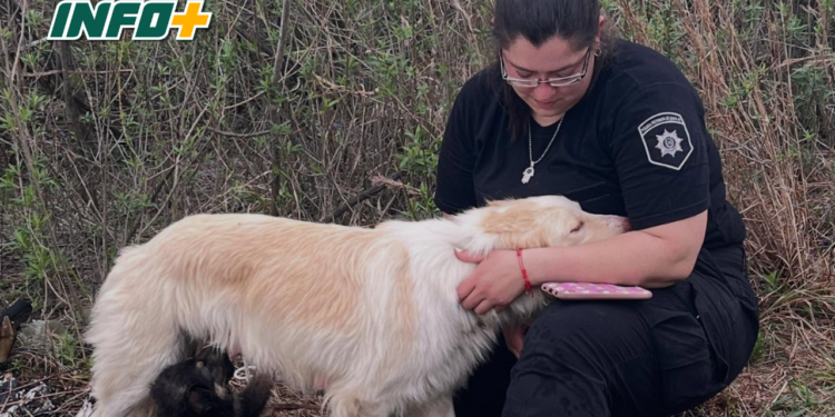 Llevaron uno de los cachorros rescatados al lugar y eso permitió que, luego de dos horas, la perra se acercara a Estefi, efectivo de la Comisaría de San Fabián, que se encargó de ponerle la correa a la perrita.