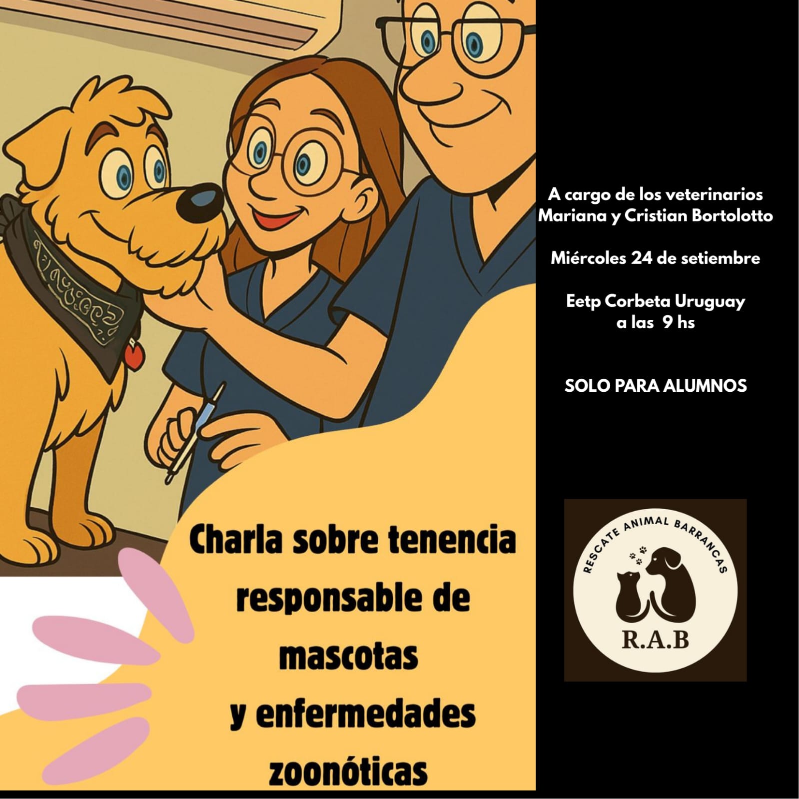 Este miércoles 24 de septiembre, la Escuela de Educación Técnico Profesional (EETP) Corbeta Uruguay de Barrancas fue escenario de una importante jornada educativa sobre tenencia responsable de mascotas y prevención de enfermedades zoonóticas, organizada con el acompañamiento de la agrupación Rescate Animal Barrancas (R.A.B.).