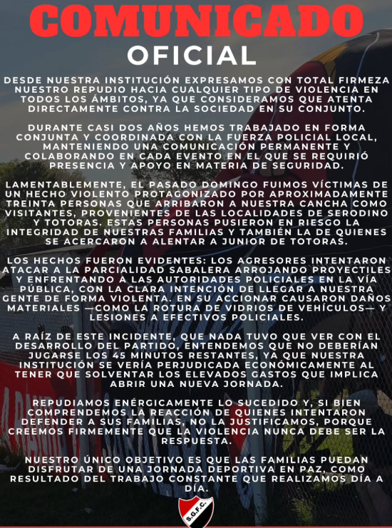 El Sebastián Gaboto Football Club emitió un comunicado oficial luego de los graves incidentes ocurridos este domingo en su cancha, que derivaron en la suspensión del encuentro ante Totoras Juniors correspondiente a la Liga Totorense de Fútbol.