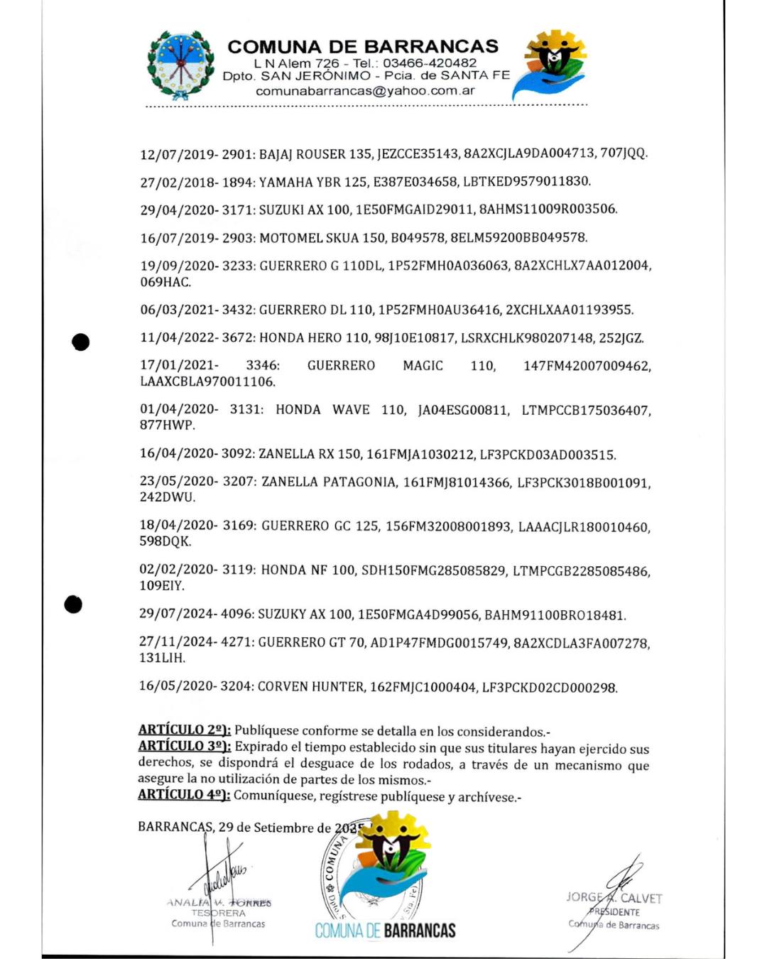 La Comuna de Barrancas informó que en el corralón comunal se encuentran cincuenta y cuatro (54) motocicletas, que fueron remitidas por personal de tránsito, muchas de las cuales llevan más de seis meses abandonadas. Según explicaron desde la administración local, la acumulación de estos vehículos representa un foco de inseguridad, contaminación y proliferación de roedores y alacranes, debido a las sustancias peligrosas que contienen.