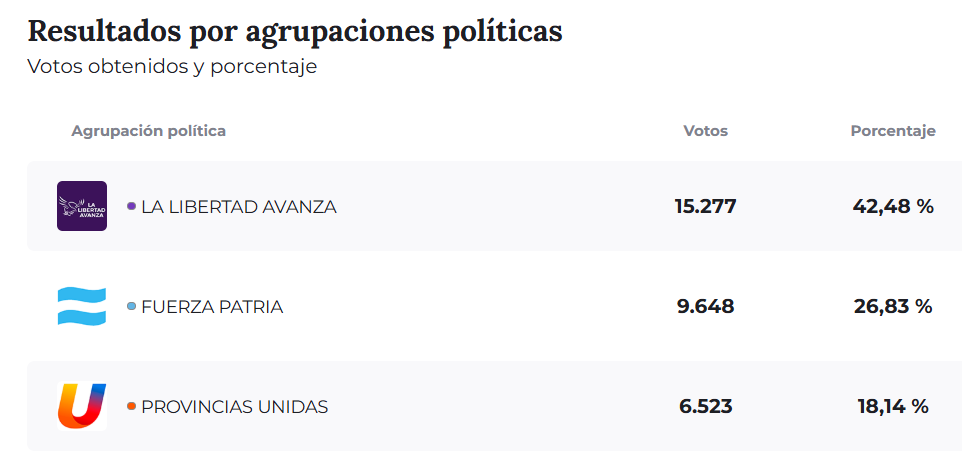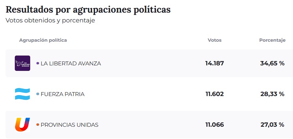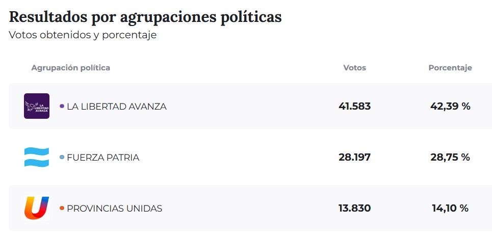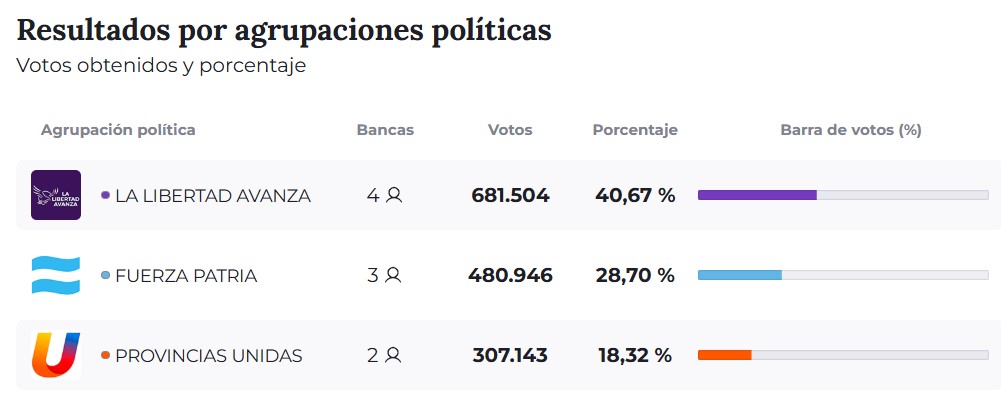 En el plano político a nivel provincial, los resultados dejaron como fuerza más votada a La Libertad Avanza, que obtuvo 681.504 votos, equivalentes al 40,67 %. En segundo lugar se ubicó Fuerza Patria, con 480.946 votos (28,70 %) mientras que Provincias Unidas alcanzó el 18,32 % con 307.143 votos.