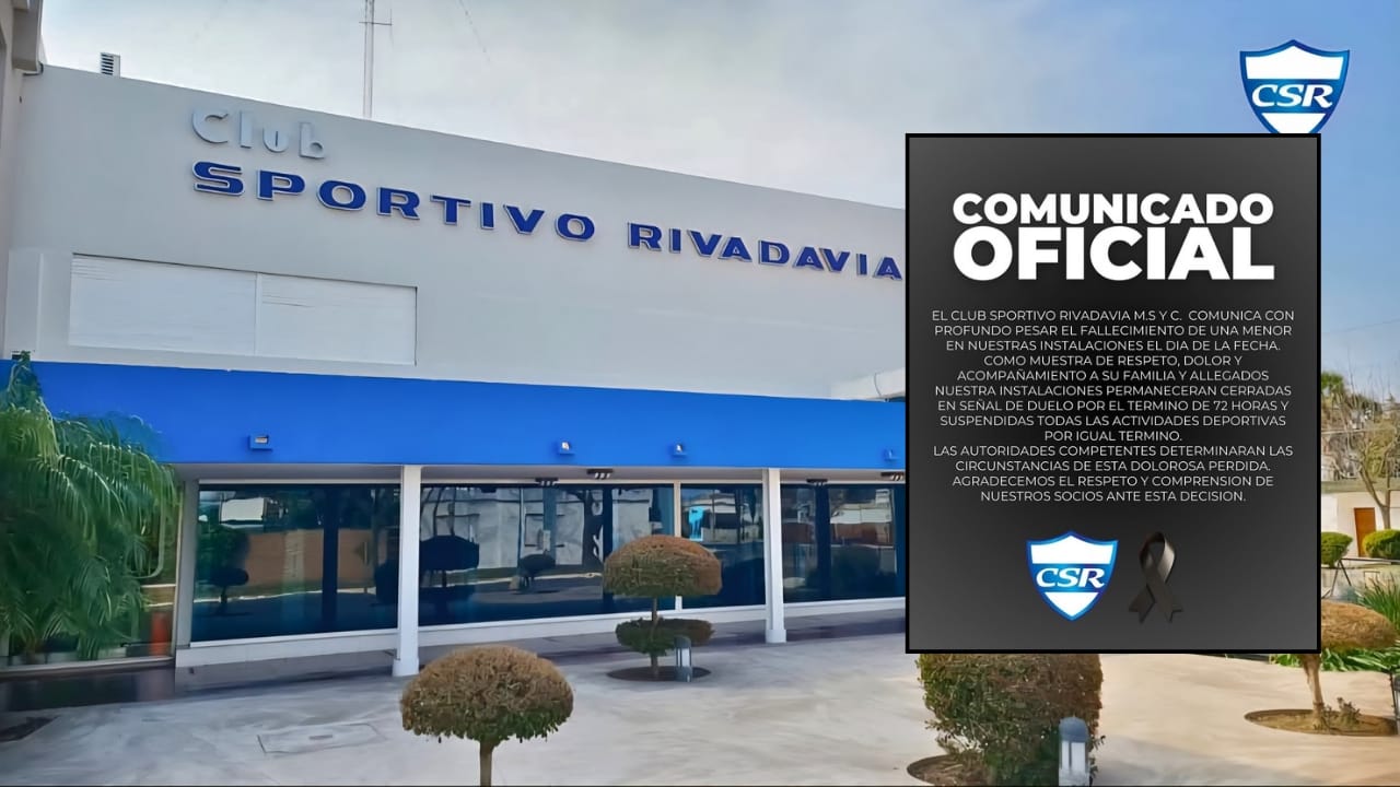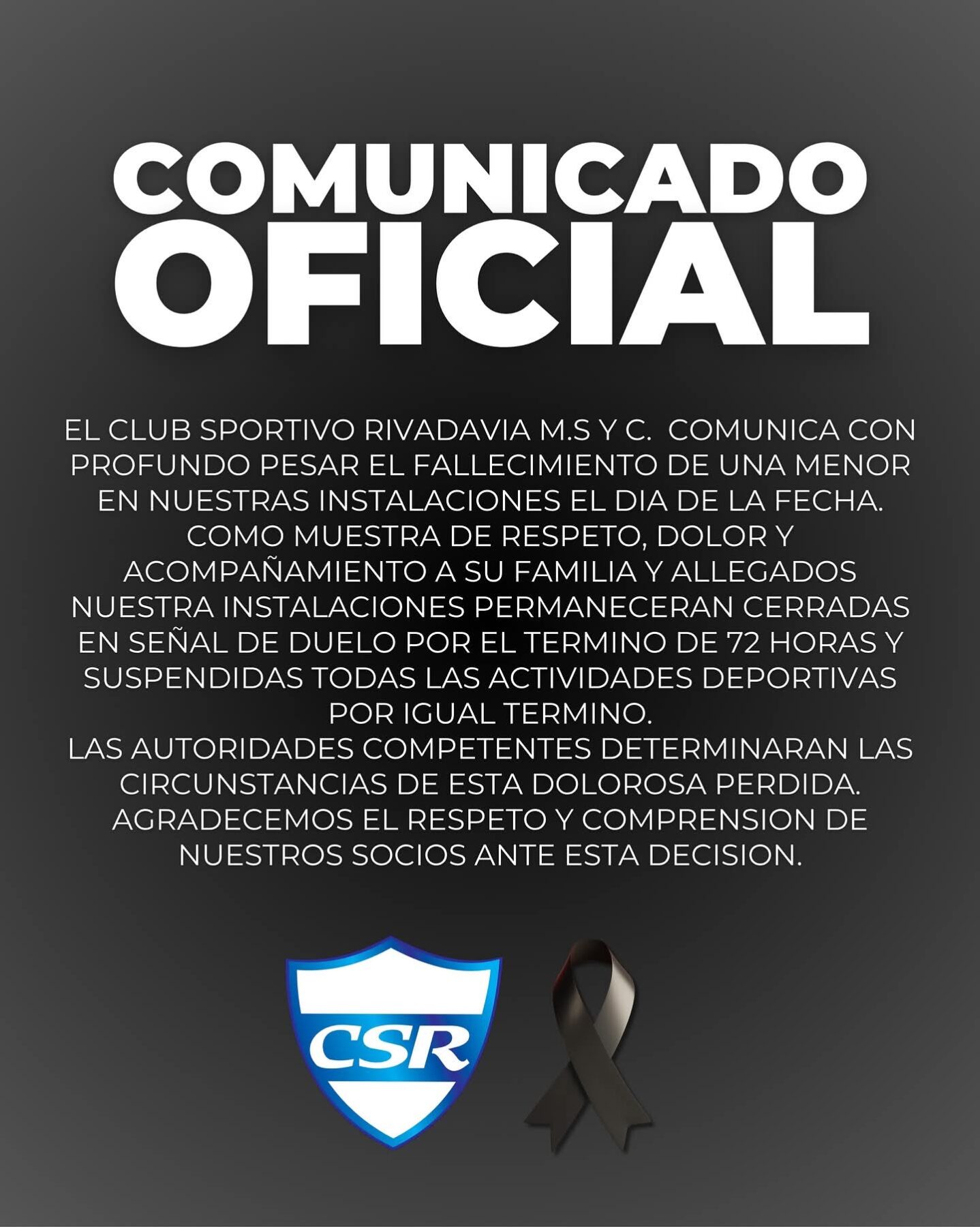 «El Club Sportivo Rivadavia M.S y C. comunica con profundo pesar el fallecimiento de una menor en nuestras instalaciones el día de la fecha. Como muestra de respeto, dolor y acompañamiento a su familia y allegados, nuestras instalaciones permanecerán cerradas en señal de duelo por el término de 72 horas y suspendidas todas las actividades deportivas por igual término.