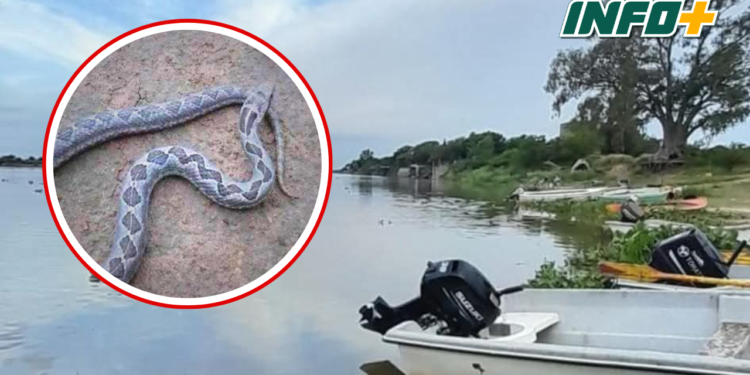La serpiente estaba oculta entre los camalotes que, debido al viento y la creciente del río, suelen acumularse en la orilla. Se trata de una familia domiciliada en Barrancas que pasaba el día en la zona costera.