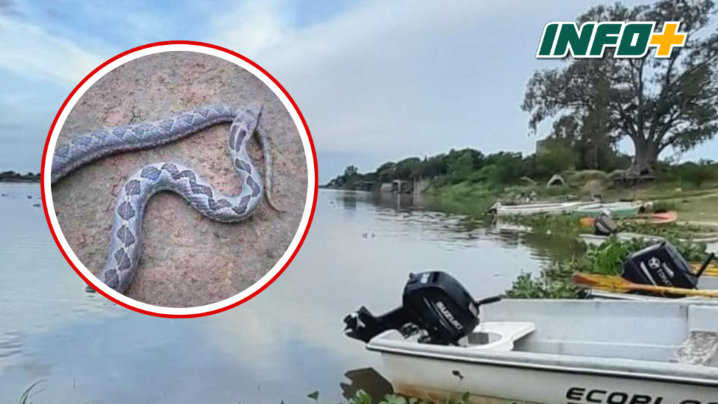 La serpiente estaba oculta entre los camalotes que, debido al viento y la creciente del río, suelen acumularse en la orilla. Se trata de una familia domiciliada en Barrancas que pasaba el día en la zona costera.