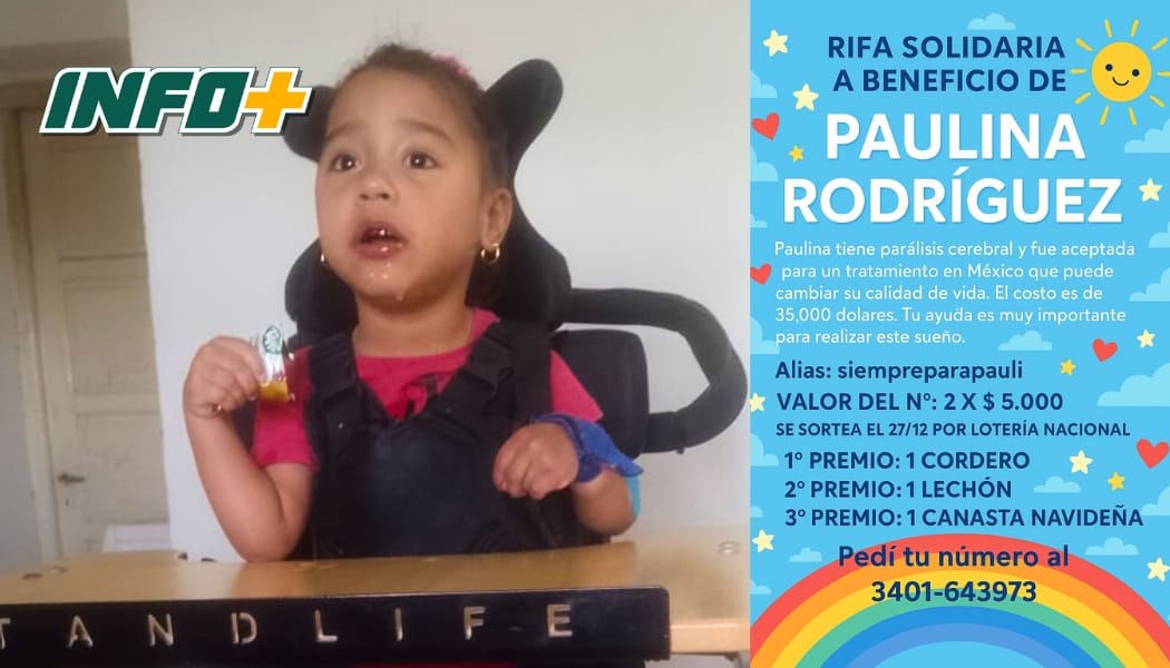 Una campaña solidaria se puso en marcha para acompañar a Paulina Rodríguez, una pequeña de 3 años de la localidad de Clason con parálisis cerebral, quien fue aceptada para realizar un tratamiento en México que podría mejorar de manera significativa su calidad de vida.