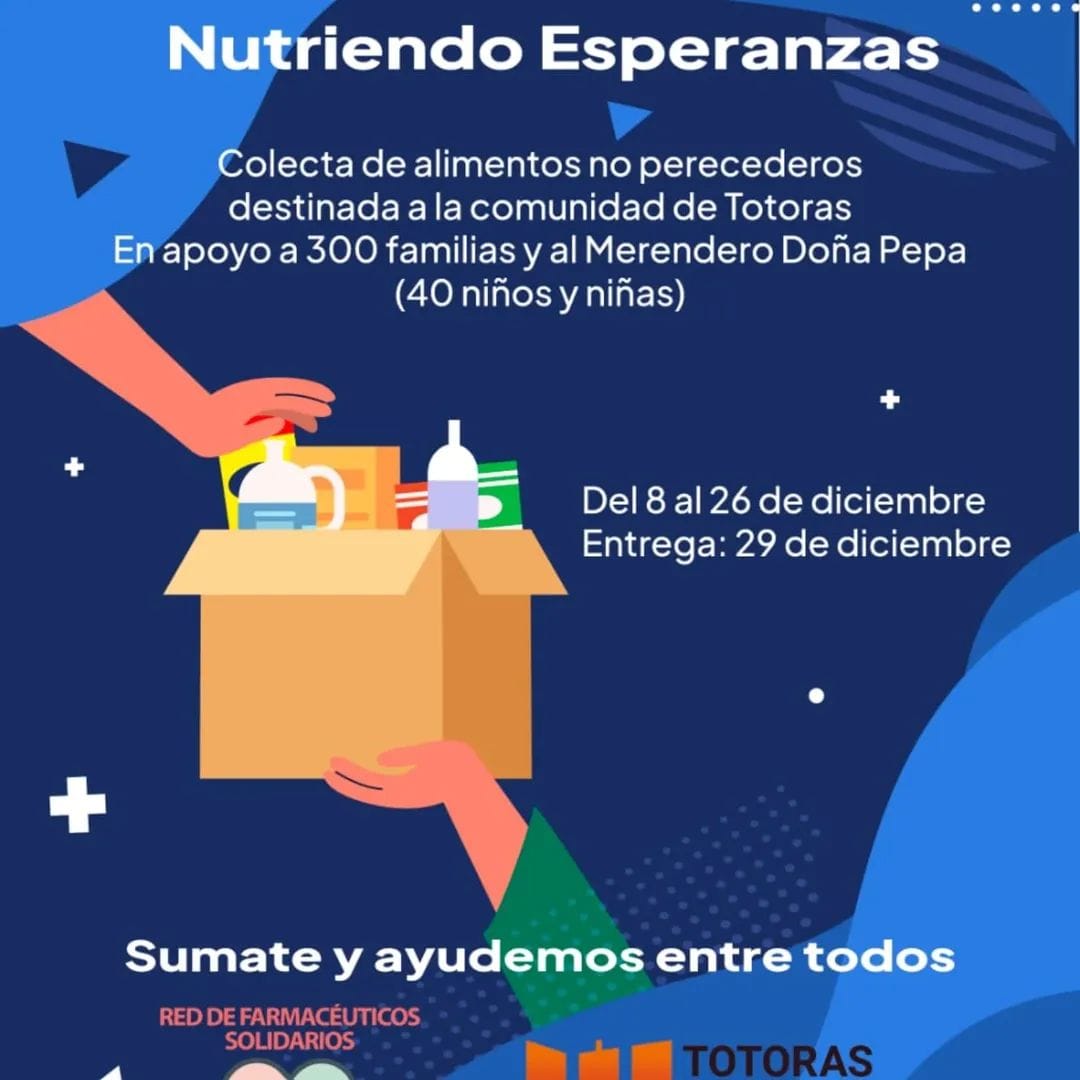 La Red de Farmacéuticos Solidarios, junto a la Municipalidad de Totoras, llevan adelante una colecta de alimentos no perecederos destinada a acompañar a familias de la comunidad y al Hogar Doña Pepa, una institución que brinda contención y asistencia a niños y niñas de la ciudad.