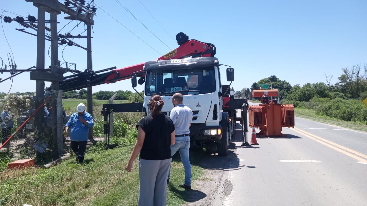 Desde la EPE llegaron con un nuevo transformador de 1.250 kV y una grúa que permitió la rápida instalación del mismo, para lo que fue necesario cortar por algunos minutos el tránsito en la Ruta 91.