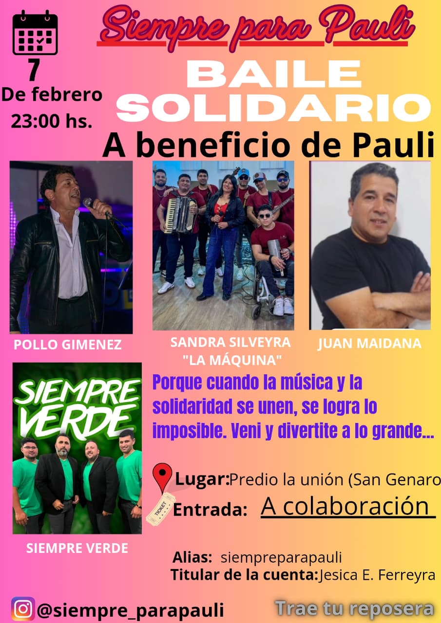 En ese marco, el próximo sábado 7 de febrero, desde las 23 horas, se realizará un baile solidario en el Predio La Unión, de San Genaro, bajo el lema “Siempre para Pauli”. El evento contará con la participación de reconocidos artistas locales y regionales como Pollo Giménez, Sandra Silveyra “La Máquina”, Juan Maidana y el grupo Siempre Verde.